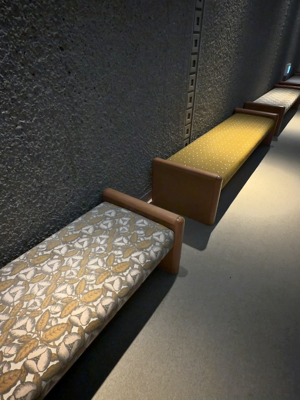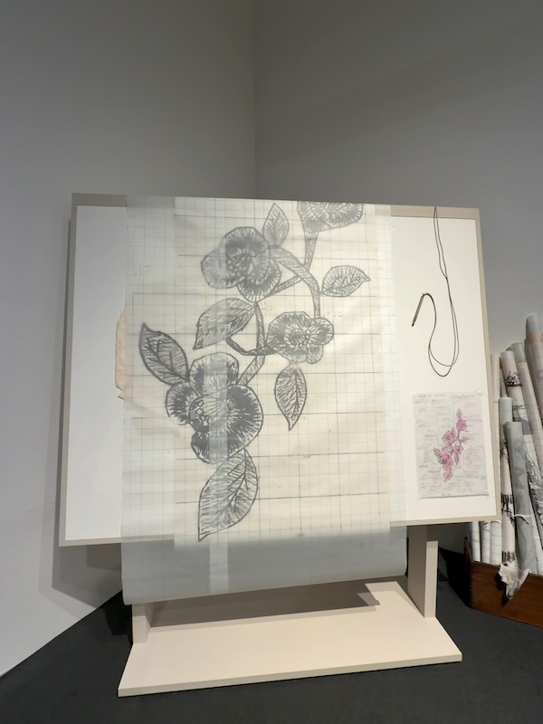 このエリアでは、柄の原画や織り見本とともに布そのものが展示され、その表情豊かな質感や色合いが、光と影の変化とともに語りかけます。