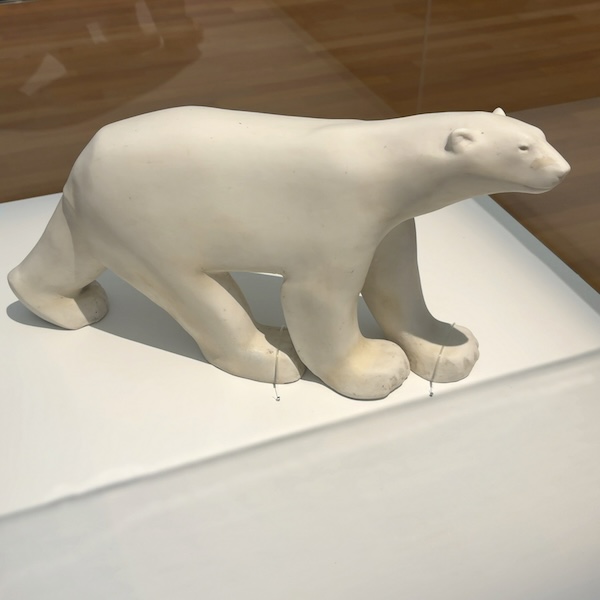 ガラスケースの中に置かれた純白のシロクマは、ほとんど抽象に近い造形でありながら、たしかにクマの重さと歩みが感じられます。